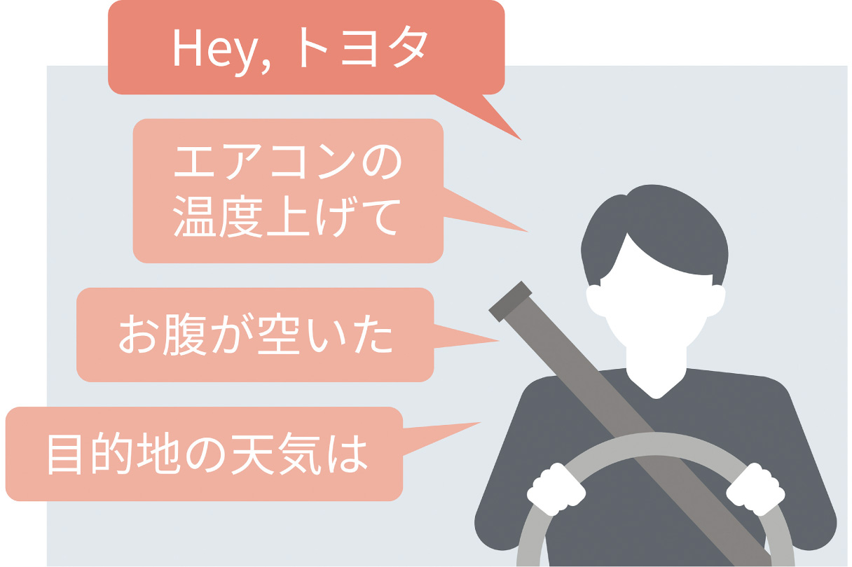 スイッチ操作は不要、あなたの声にクルマが応えます。「Hey,トヨタ」と話しかけるだけで、エージェントが起動して目的地検索や天気予報などの情報をご提供します。また、エアコンの温度調整や窓の開閉など、車両の操作も可能。声によるさまざまなご要望にエージェントがお応えします。