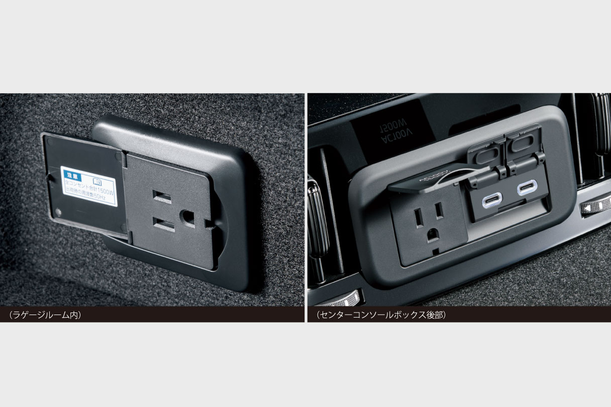 コンセント(AC100V・1500W)を、車内2カ所に設置。非常時給電システムを使用することで、災害などによる非常時に電力が必要なとき、車両の走行機能を停止した状態で、AC100Vで消費電力の合計が1500W以下の電気製品*2を使用できます。