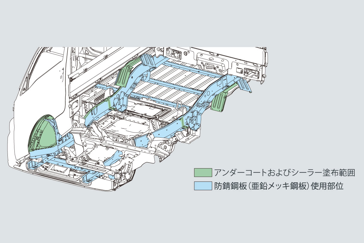フレームにも防錆鋼板(亜鉛メッキ鋼板)を使うなど、泥道や雪道を多く走る状況に備え、下回りの防錆も強化しました。